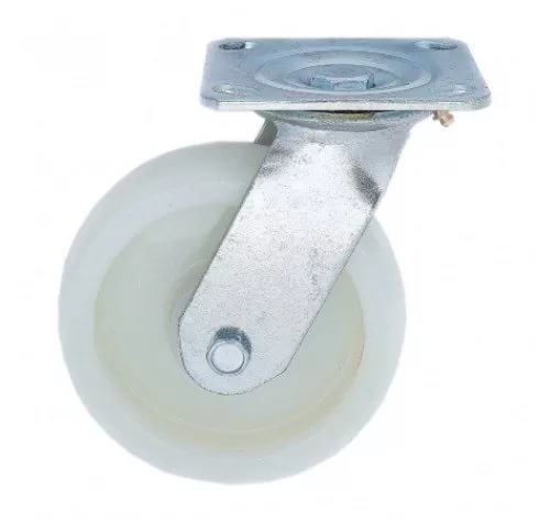 Большегрузные колеса поворотные из полиамида (нейлона) изготовлены из белого полиамидного волокна, отлитого под давлением, они коррозионно-устойчивы, материал колес устойчив к воздействию множества агрессивных химических веществ и соединений, такие колеса и ролики имеют высокую механическую прочность, низкое сопротивление качению.