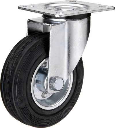 Колесные опоры промышленные усиленные с платформенным креплением. Шинка - полуэластичная черная резина, обод из прессованной листовой стали, заклепан.