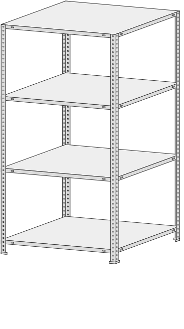 4 полки, 4 стойки, 4 подпятника, 16 уголков жесткости, 64 компл. крепежа.| Тип стеллажей | Болтовое соединение |