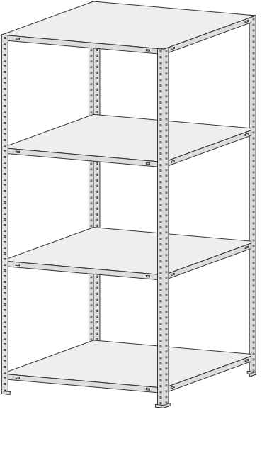 4 полки, 4 стойки, 4 подпятника, 16 уголков жесткости, 64 компл. крепежа.| Тип стеллажей | Болтовое соединение |