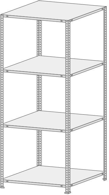 4 полки, 4 стойки, 4 подпятника, 16 уголков жесткости, 64 компл. крепежа.| Тип стеллажей | Болтовое соединение |