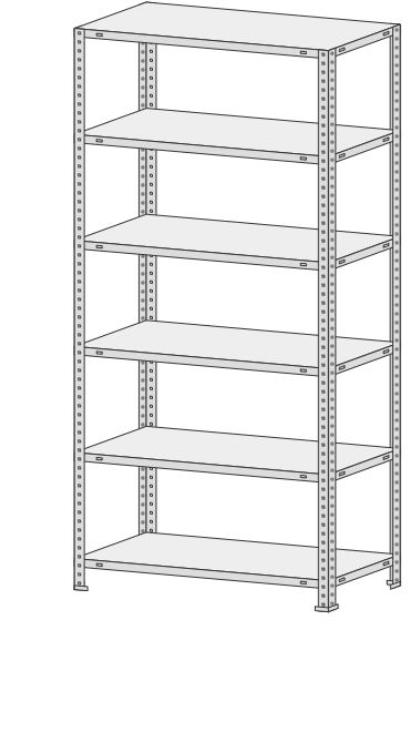 5 полок, 4 стойки, 4 подпятника, 16 уголков жесткости, 64 комп. крепежа.| Тип стеллажей | Болтовое соединение |