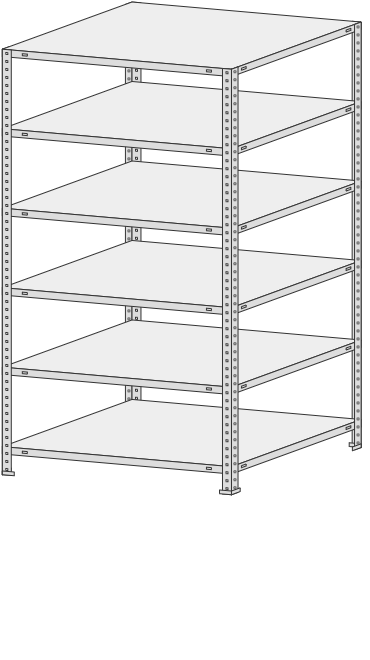 5 полок, 4 стойки, 4 подпятника, 16 уголков жесткости, 64 комп. крепежа.| Тип стеллажей | Болтовое соединение |