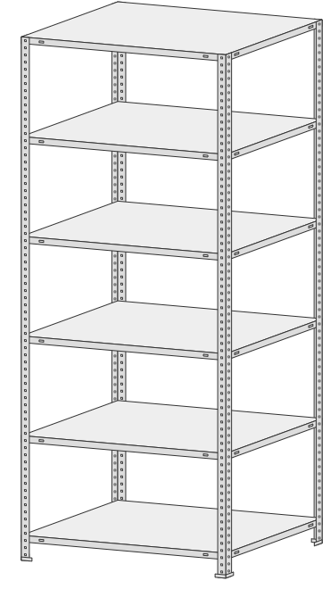 5 полок, 4 стойки, 4 подпятника, 16 уголков жесткости, 64 комп. крепежа.| Тип стеллажей | Болтовое соединение |