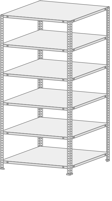 5 полок, 4 стойки, 4 подпятника, 16 уголков жесткости, 64 комп. крепежа.| Тип стеллажей | Болтовое соединение |