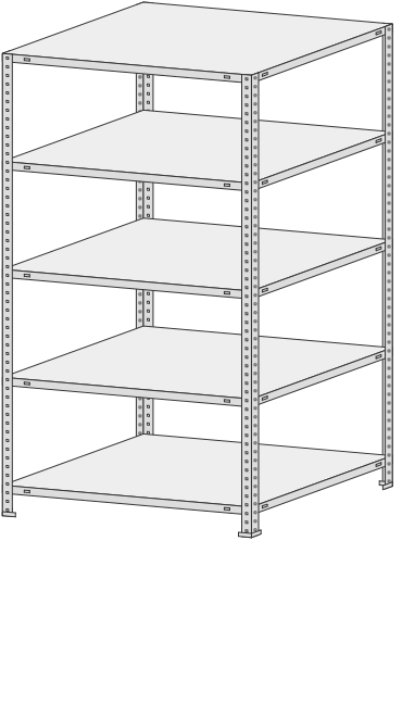 5 полок, 4 стойки, 4 подпятника, 16 уголков жесткости, 64 комп. крепежа.| Тип стеллажей | Болтовое соединение |