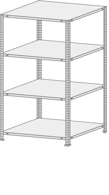 4 полки, 4 стойки, 4 подпятника, 16 уголков жесткости, 64 комп. крепежа.| Тип стеллажей | Болтовое соединение |