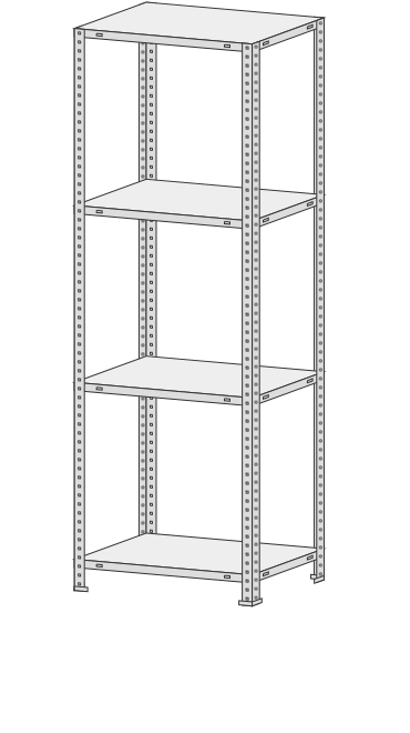 4 полки, 4 стойки, 4 подпятника, 16 уголков жесткости, 64 комп. крепежа.| Тип стеллажей | Болтовое соединение |