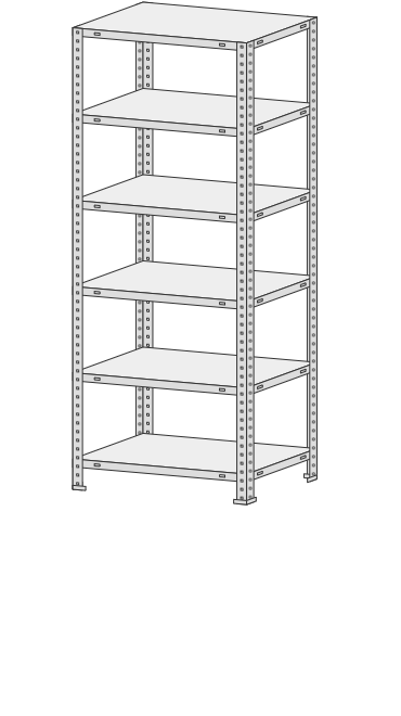 5 полок, 4 стойки, 4 подпятника, 16 уголков жесткости, 64 комп. крепежа.| Тип стеллажей | Болтовое соединение |