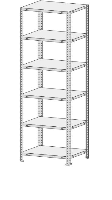 5 полок, 4 стойки, 4 подпятника, 16 уголков жесткости, 64 комп. крепежа.| Тип стеллажей | Болтовое соединение |