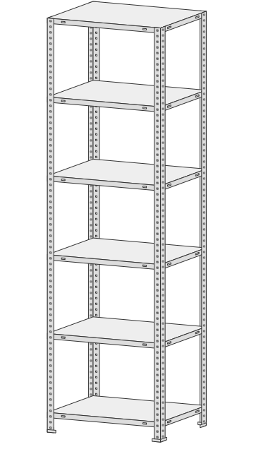 5 полок, 4 стойки, 4 подпятника, 16 уголков жесткости, 64 комп. крепежа.| Тип стеллажей | Болтовое соединение |