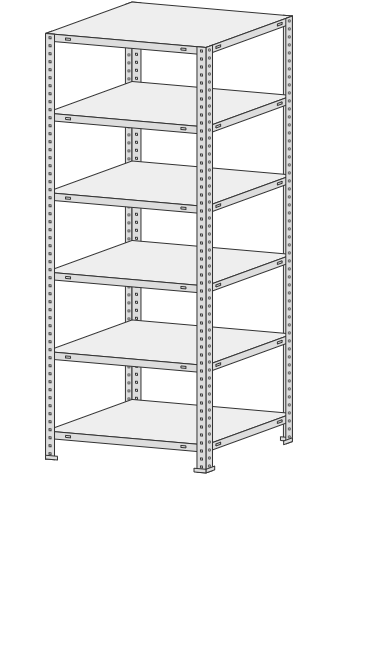 5 полок, 4 стойки, 4 подпятника, 16 уголков жесткости, 64 комп. крепежа.| Тип стеллажей | Болтовое соединение |
