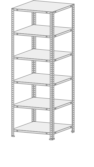 5 полок, 4 стойки, 4 подпятника, 16 уголков жесткости, 64 комп. крепежа.| Тип стеллажей | Болтовое соединение |