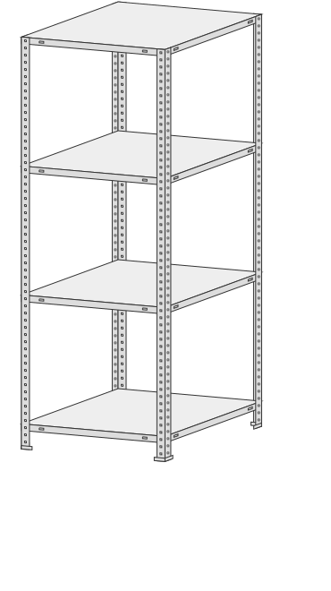 4 полки, 4 стойки, 4 подпятника, 16 уголков жесткости, 64 комп. крепежа.| Тип стеллажей | Болтовое соединение |