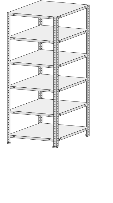 5 полок, 4 стойки, 4 подпятника, 16 уголков жесткости, 64 комп. крепежа.| Тип стеллажей | Болтовое соединение |