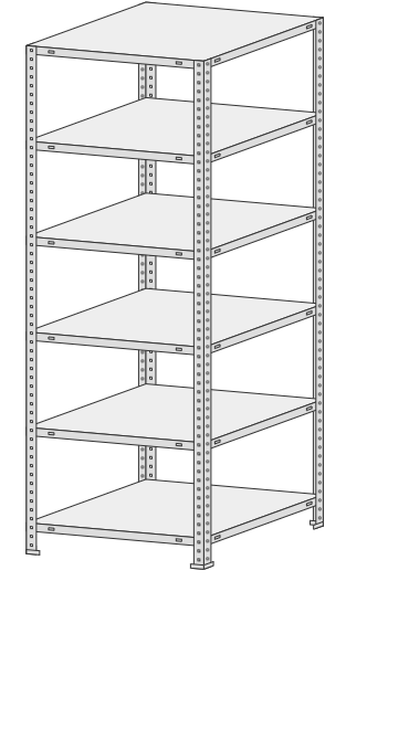 5 полок, 4 стойки, 4 подпятника, 16 уголков жесткости, 64 комп. крепежа.| Тип стеллажей | Болтовое соединение |