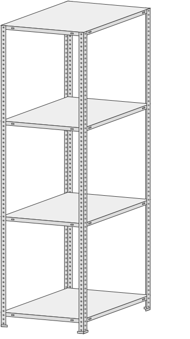4 полки, 4 стойки, 4 подпятника, 16 уголков жесткости, 64 комп. крепежа.| Тип стеллажей | Болтовое соединение |