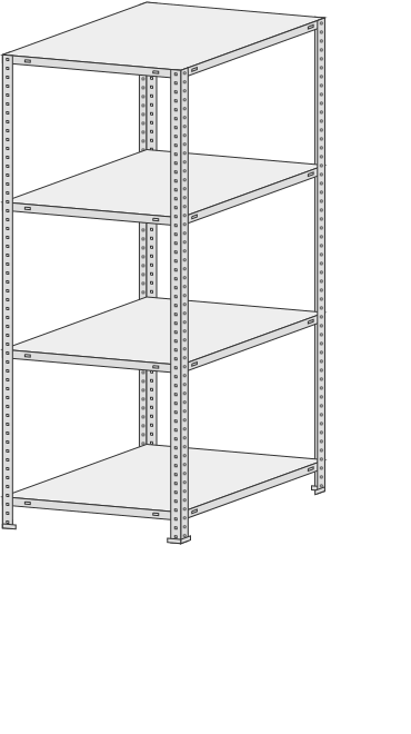 4 полки, 4 стойки, 4 подпятника, 16 уголков жесткости, 64 комп. крепежа.| Тип стеллажей | Болтовое соединение |