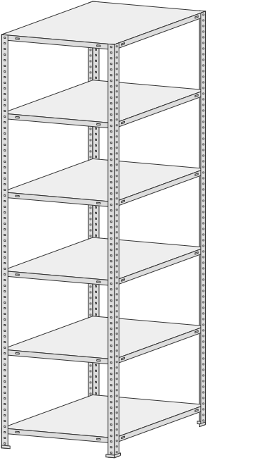5 полок, 4 стойки, 4 подпятника, 16 уголков жесткости, 64 комп. крепежа.| Тип стеллажей | Болтовое соединение |