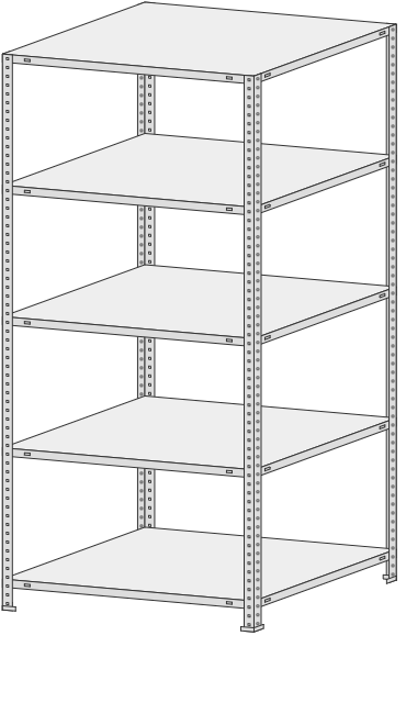 5 полок, 4 стойки, 4 подпятника, 16 уголков жесткости, 64 комп. крепежа.| Тип стеллажей | Болтовое соединение |