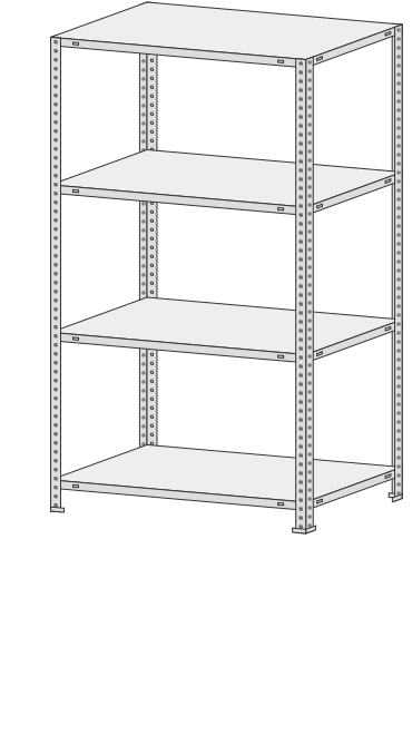 4 полки, 4 стойки, 4 подпятника, 16 уголков жесткости, 64 компл. крепежа.| Тип стеллажей | Болтовое соединение |