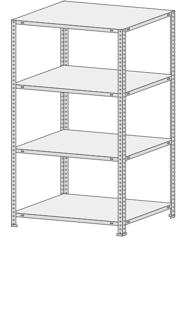 4 полки, 4 стойки, 4 подпятника, 16 уголков жесткости, 64 компл. крепежа.| Тип стеллажей | Болтовое соединение |